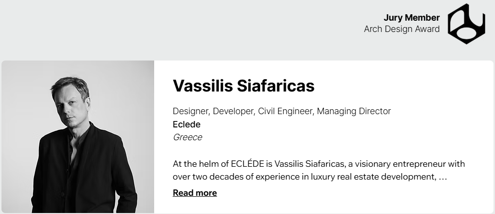 Distinguished designer Vassilis Siafaricas, Founder and Managing Director of ECLÉDE, has been selected to serve as a jury member for the prestigious Arch Design Awards 2026.